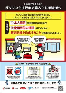 ガソリンスタンドで携行缶にガソリンを入れてもらって購入する際、スタンドのスタッフにガソリンの使用目的を必ず聞かれます。ガソリンスタンドは消防法に基づいて、ガソリンの販売日や購入者の氏名・住所、使用目的、販売量等を記録した販売記録を作成しないといけなくなったからです。(令和元年総務省令第67号)