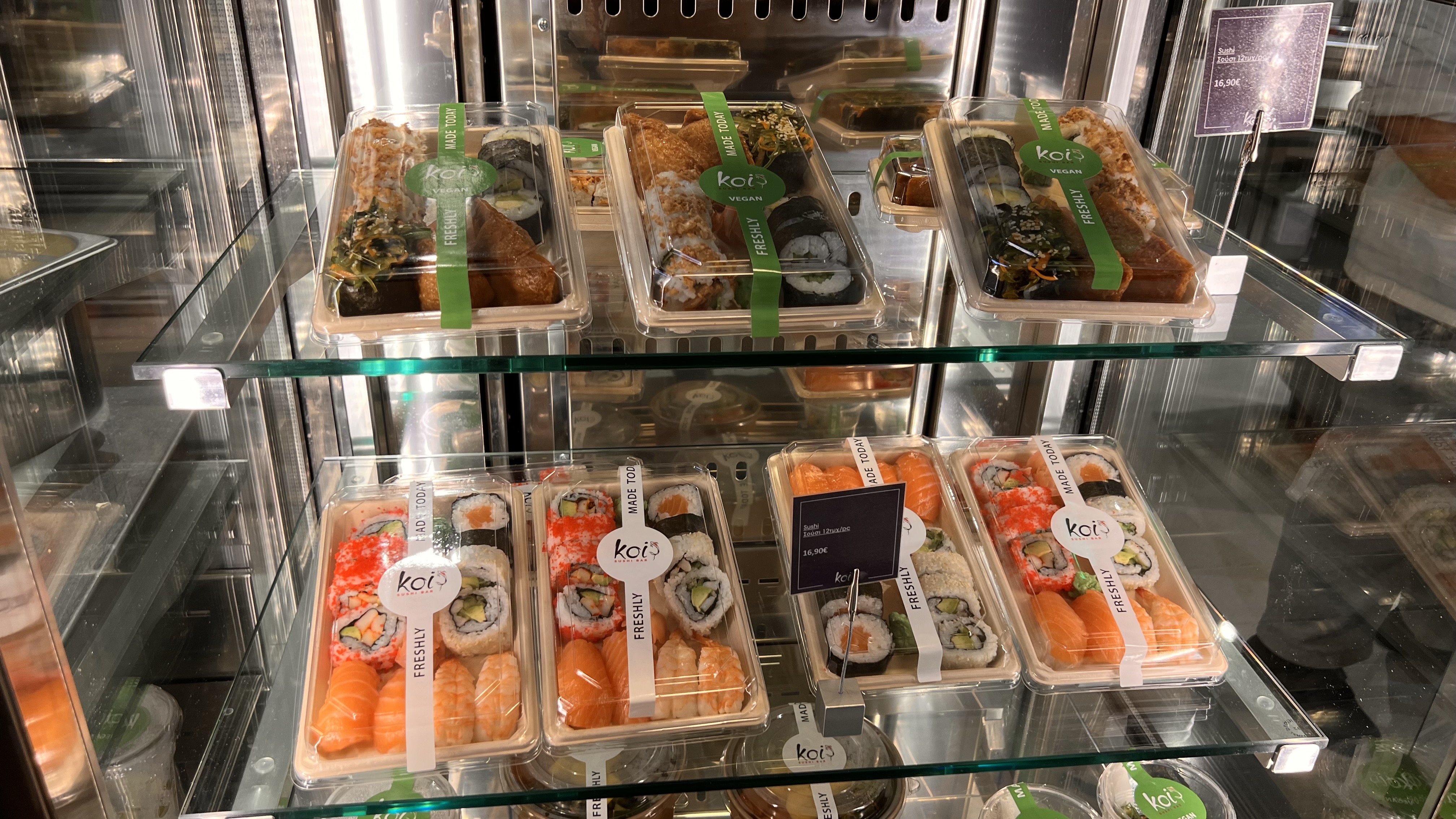 水を買ったらお腹が空いてきたので、朝ご飯を食べようとぶらぶらしていたら「Food Village」というフードコートがあったので行ってみることに。中を見てみると「Koi Sushi Bar」という日本料理屋がありました!