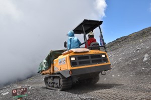 登っている途中、ブルドーザーとすれ違いました。このブルドーザーは富士山の山小屋で働いている人や物資、また怪我をした登山者を運ぶために使われている乗り物で、富士山の険しい悪路もすいすいと進むことができます。