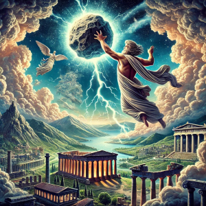 2羽のイヌワシが世界の端から飛んできて交差したデルフィこそが「世界の中心」、つまり「地のへそ」とゼウスは考えたのでしょう。この世界の中心に、ゼウスは天から石を投げつけます。その石がこのオンファロスというわけです。