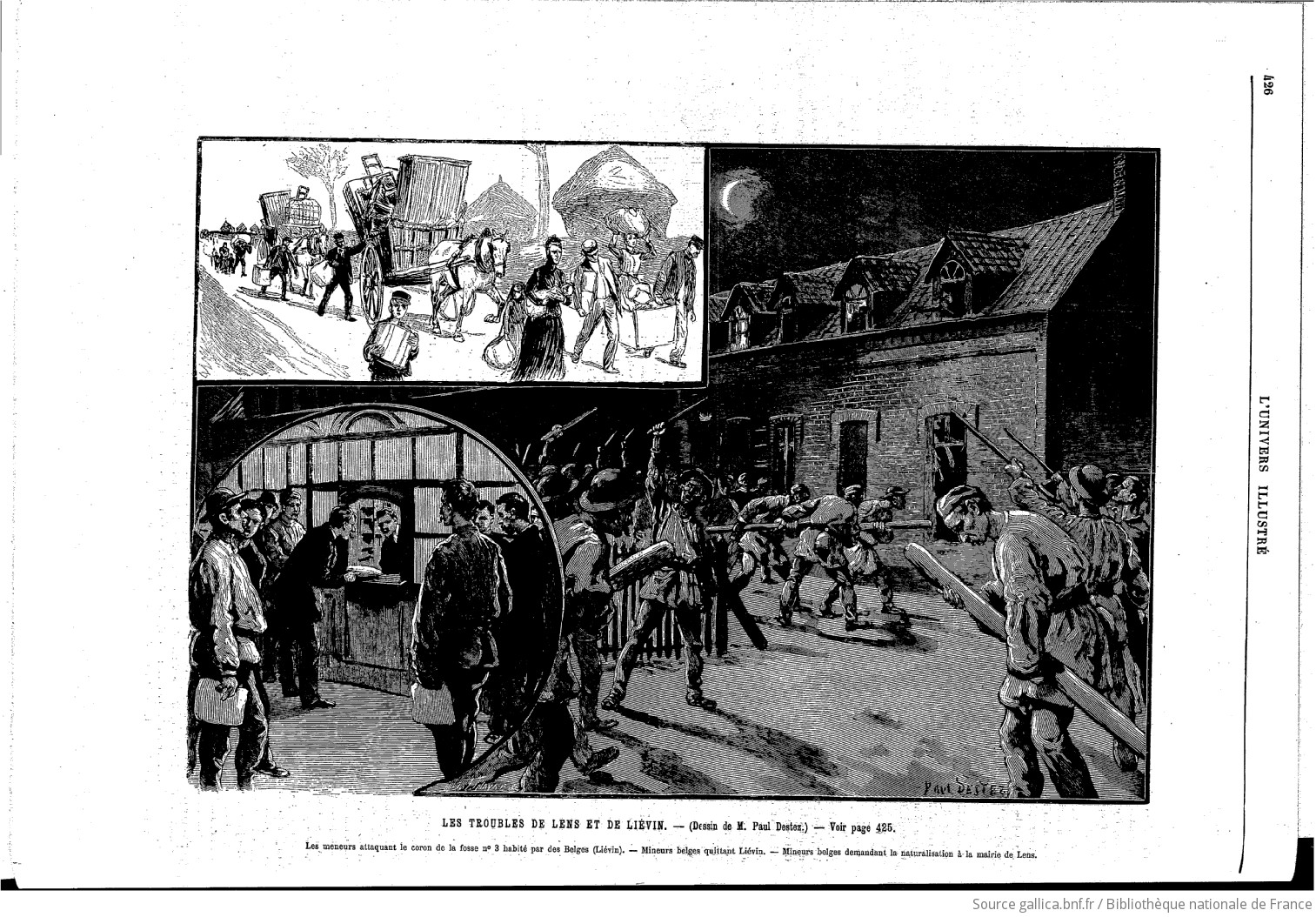 Paul Destez, “Les troubles de Lens et de Liévin”, “Mineurs belges demandant la naturalisation à la mairie de Lens“, “Mineurs belges quittant Liévin“, L’Univers Illustré ガリカより引用