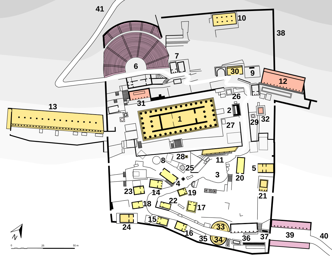 その後、紀元前160年から159年にかけてペルガモン王エウメネス2世の資金援助で改修され、現在の石造りの姿はローマ帝国時代初期に再建されたものです。