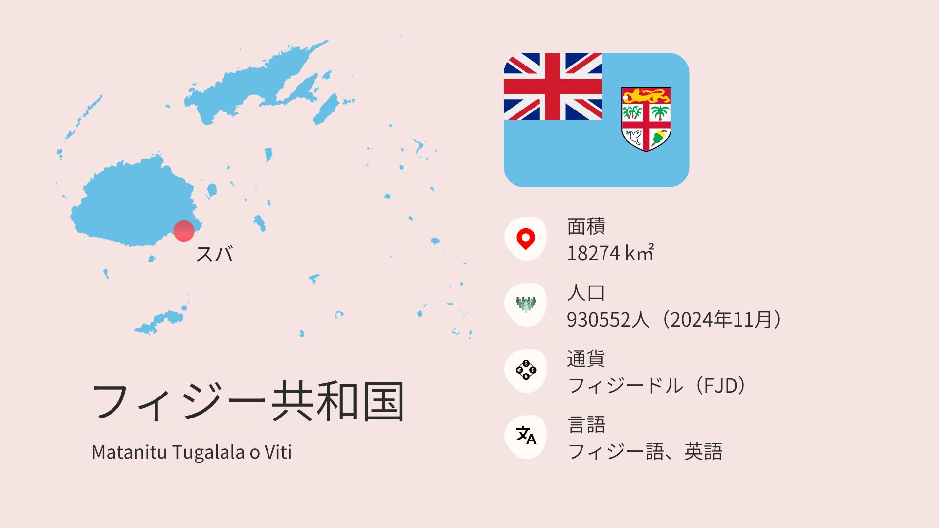 フィジーは四国と同じくらいの面積で、人口は世田谷区とほぼ同じです。