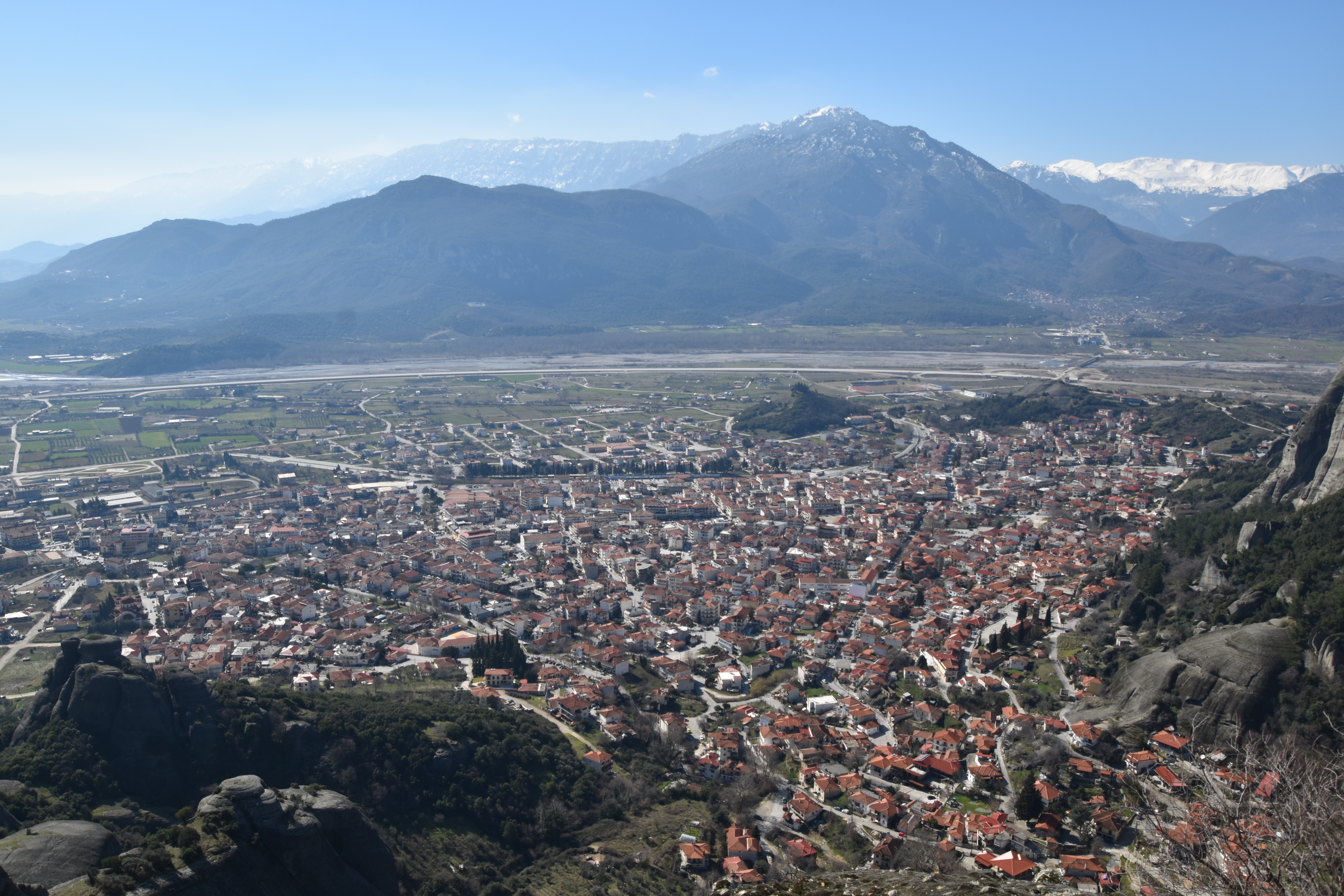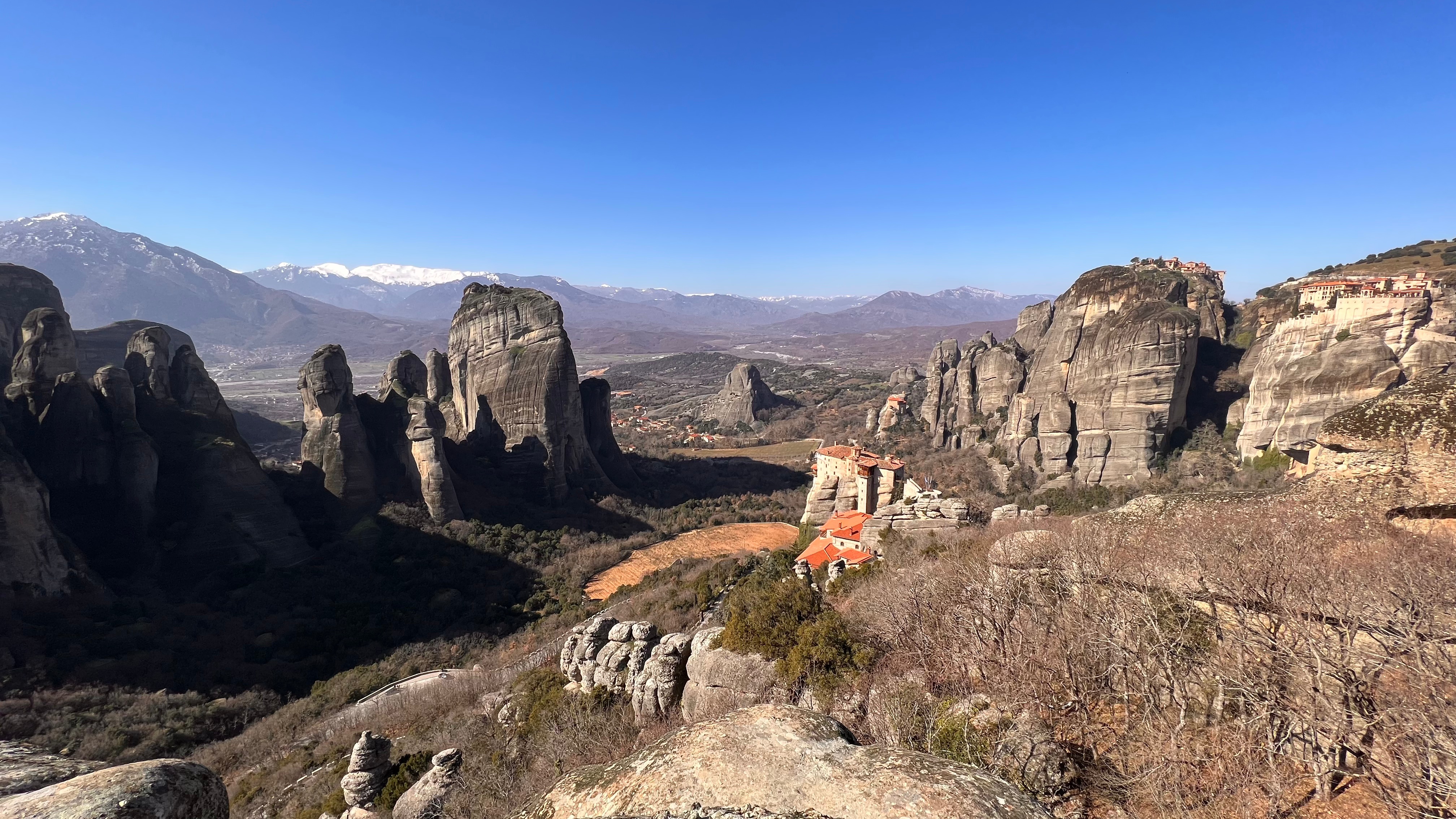 遠くにはカランバカの街並みとテッサリア平原が広がり、視界の果てまで続くその眺望に思わず息をのみます。