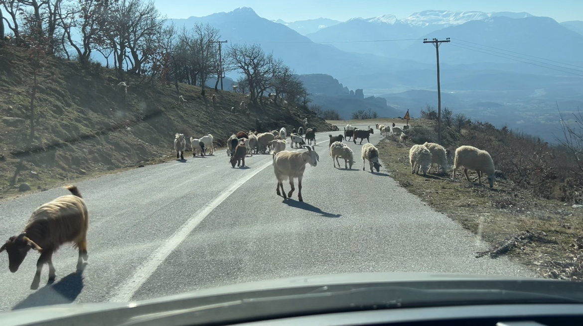 車を停めてしばらく眺めていると、牧羊犬らしき犬が最後尾をきっちりと見張りながら、群れをゆっくりと導いていきます。その光景はまるで絵本の1ページのようで、観光名所ではない日常のギリシャを垣間見た瞬間でした。