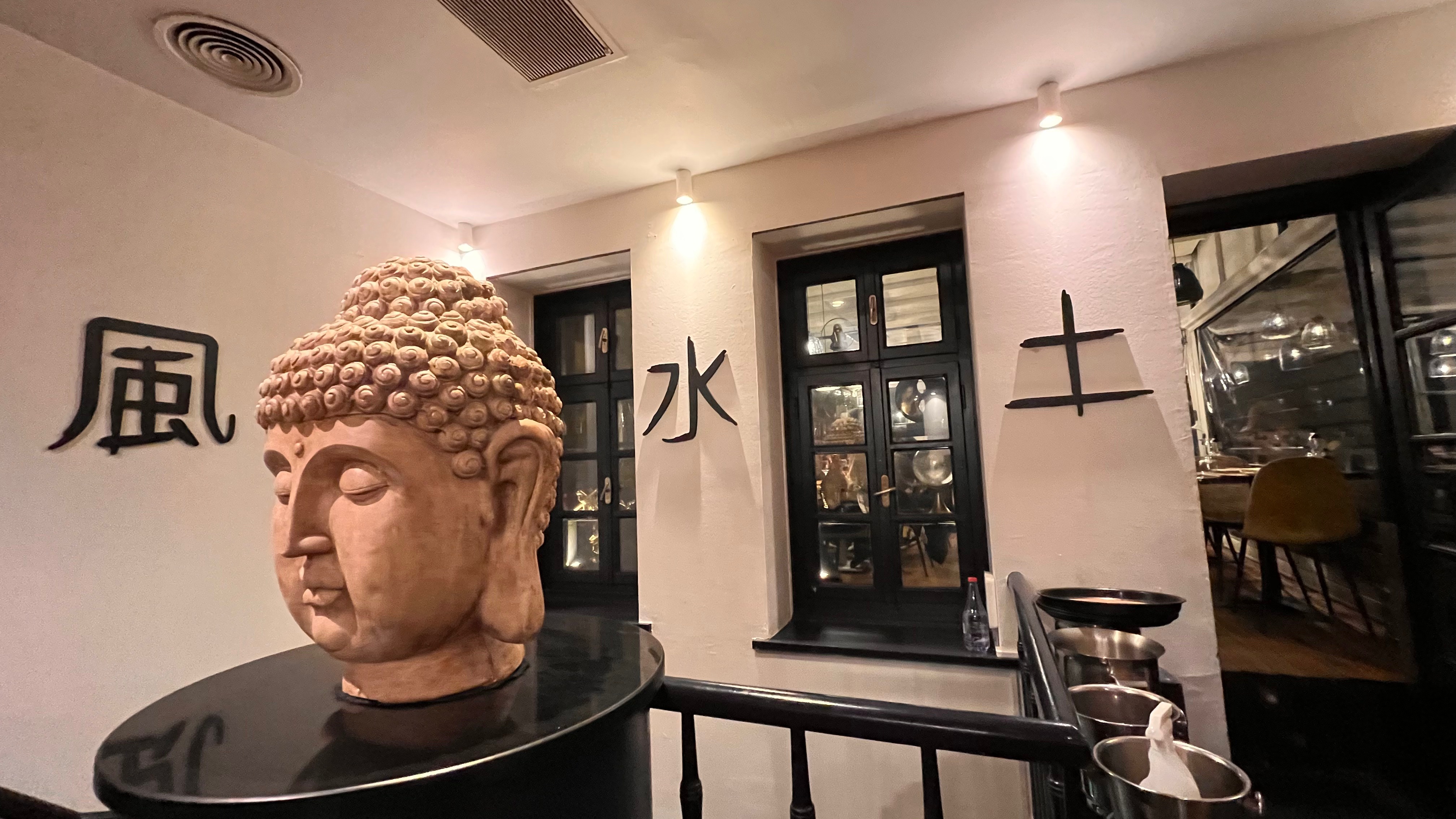 階段を上るとそこには仏像のオブジェが置かれ、壁には「風水土」の文字が。なんで風水土なんだろう…?