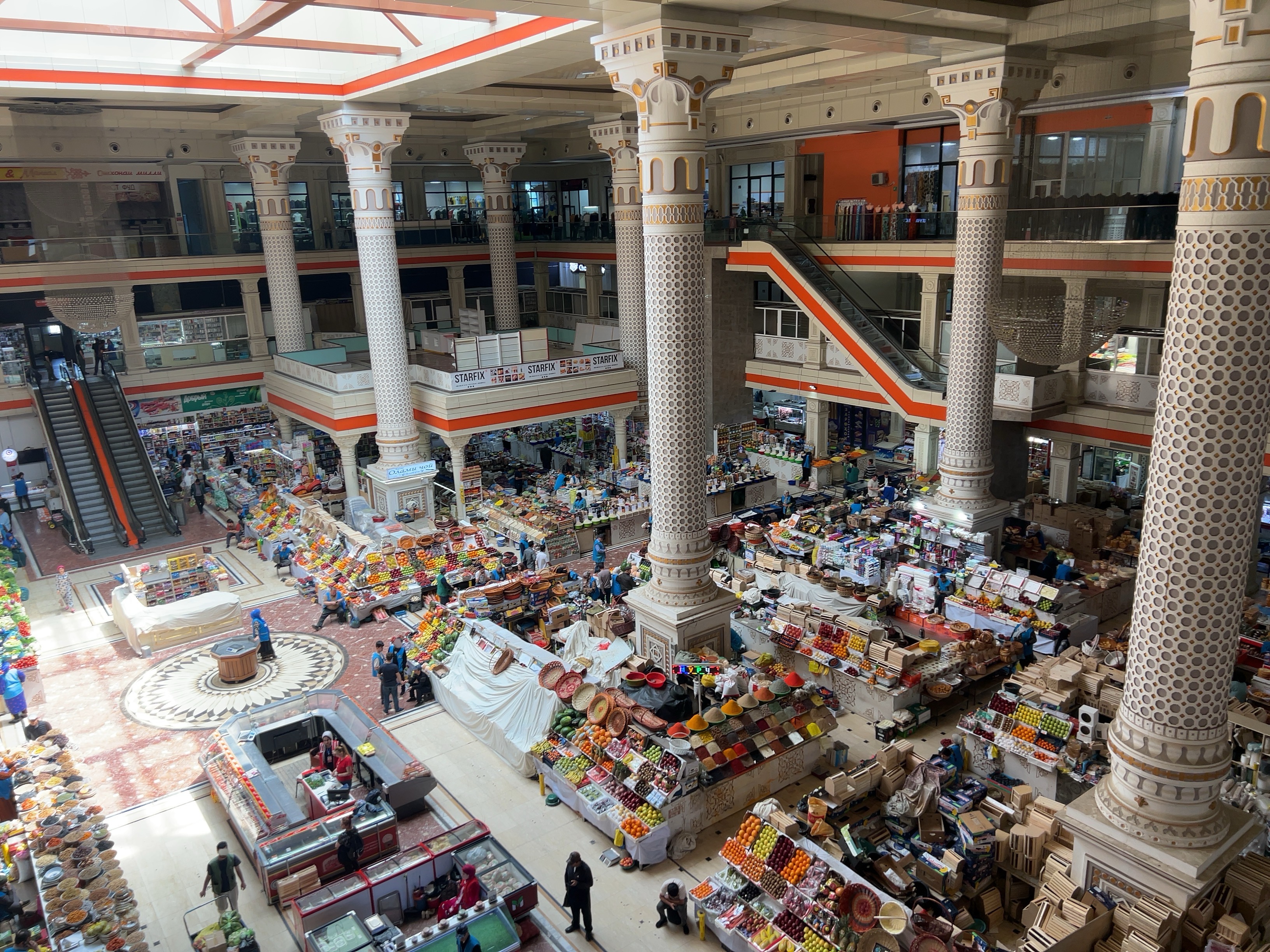 メフルゴンバザール(Mehrgon Bazaar) | 三階建ての近代的なバザールで、都市近代化の流れの中で再整備された。 広い敷地、装飾的なアーチや柱、イスラム風建築要素を所々に取り入れており、宮殿のようなバザール。 果物・野菜・ナッツ・ドライフルーツ・肉やノン(大きなパン)等の伝統的な食品が勢揃い! | 朝か午前中に行くと新鮮なものが多く、混雑も少なめ。カードは使えないから現地の現金(もしくはドル)必須! 価格交渉や試食もチャレンジを。2~3階には伝統衣装や工芸品のようなお土産から、SDカードや腕時計も売っている。 アクセスは市中心部からバスかタクシー。 頑張れば歩ける距離なので、散歩がてら行ってみるのもアリ! |
