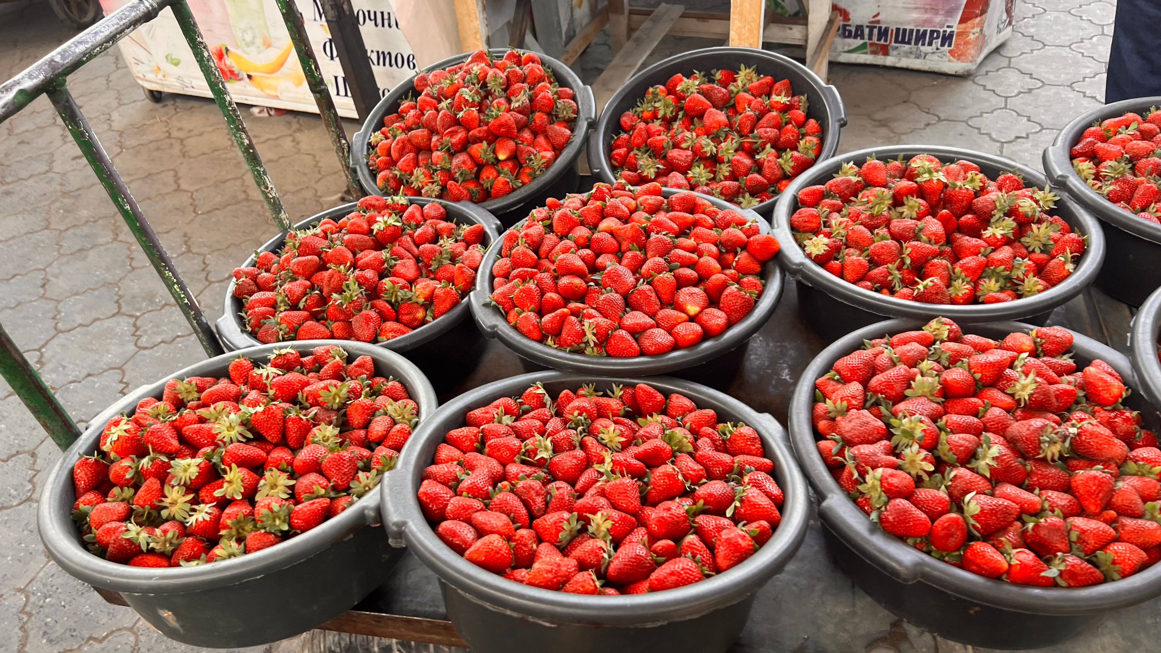 タジキスタンの大地が育んだ大ぶりの野菜に混じって、大量の中国から運ばれてきた艶やかな果実たちが、市場にさらなる色彩のグラデーションを加えています。中国との国境の近さを実感させる光景です。