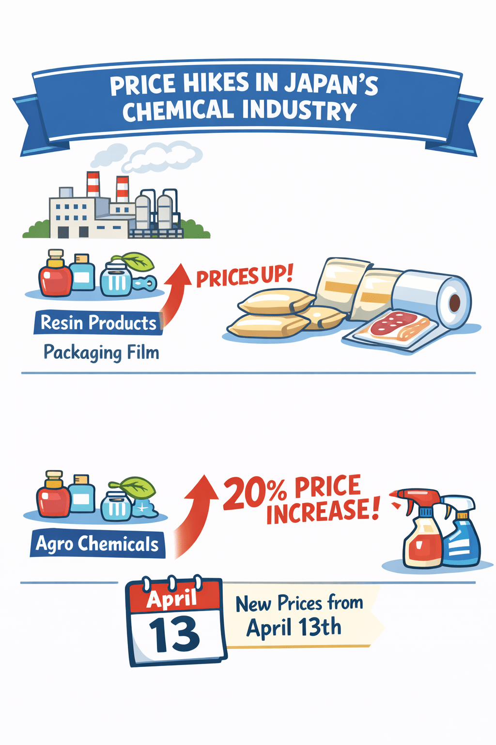 Kuraray, another major chemical company, has raised prices by an average of 20% for a range of chemical products used in fragrances, agricultural chemicals, and industrial cleaning agents, effective from shipments on the 13th of this month.