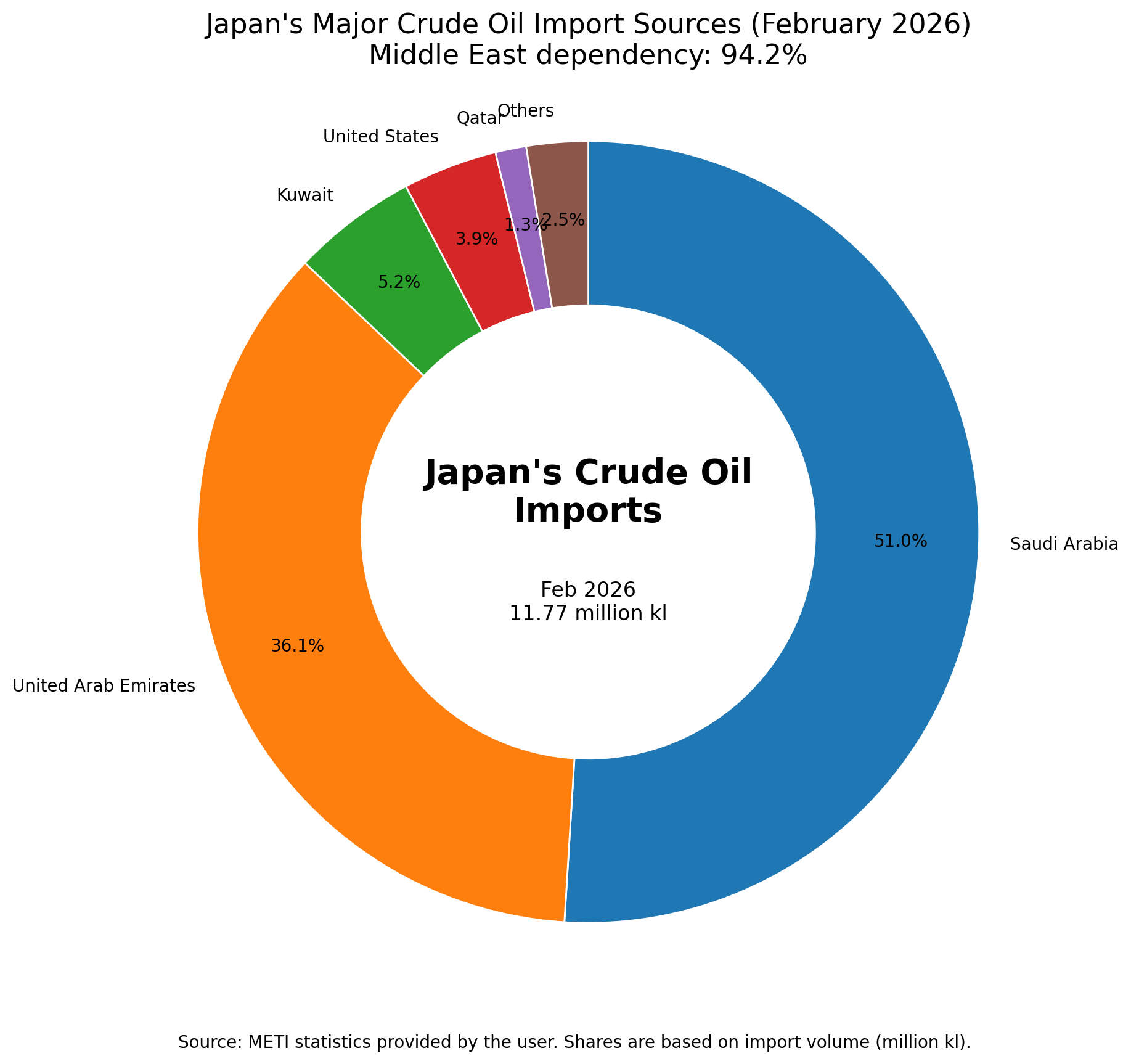 Unlike countries with domestic fossil fuel resources, Japan imports the vast majority of its energy. Approximately 90% of its crude oil comes from the Middle East.